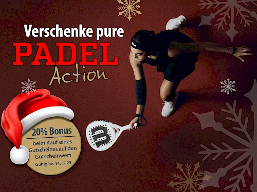 Dann sichere dir jetzt einen Padel-Weihnachtsgutschein und erhalte 20 % Bonus auf den Gutscheinwert!